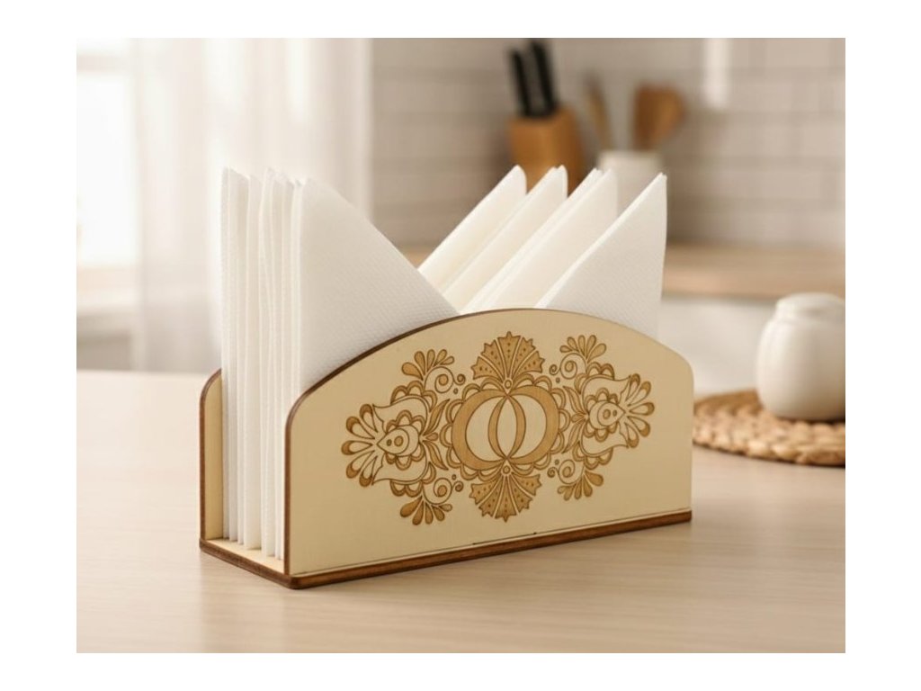Dřevěný stojánek na ubrousky s originálním podlužáckým ornamentem. Vyroben z kvalitní topolové překližky.