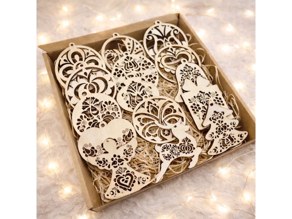 Kolekce 15 kusů vánočních ozdob z topolové překližky s jedinečným podlužáckým ornamentem - vypalované laserem, ve 3 velikostech.