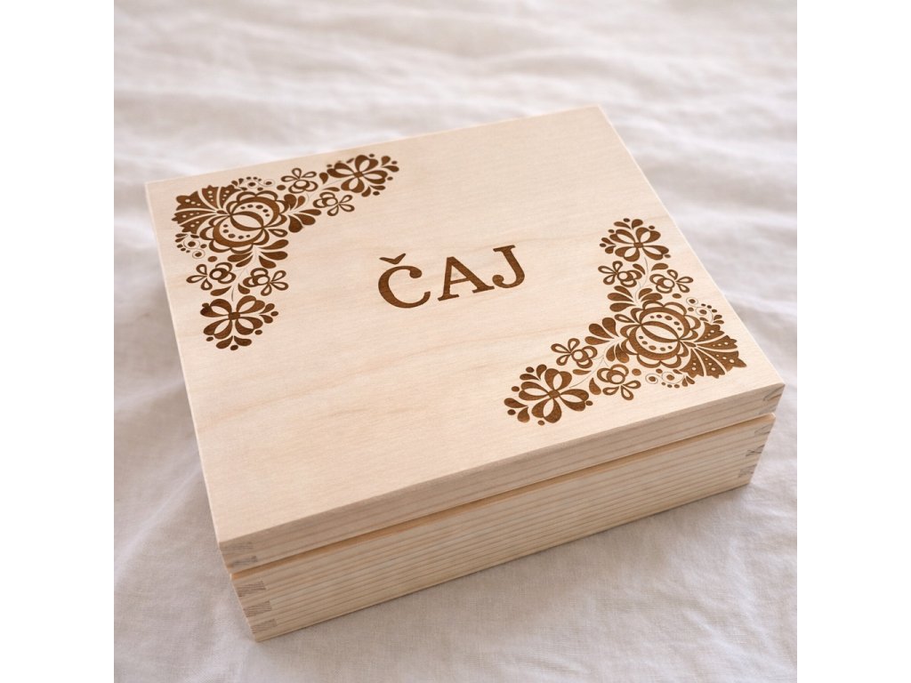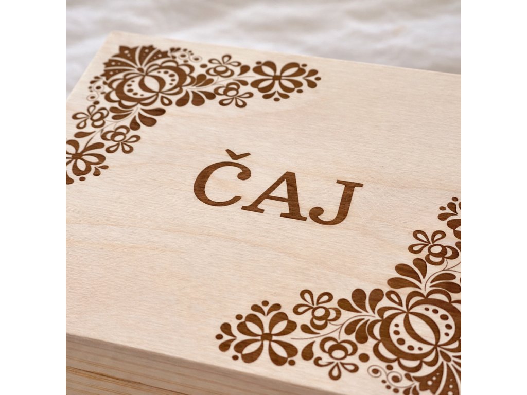 Objevte kouzlo tradičního českého řemesla s naší dřevěnou krabičkou na čaj! Každá krabička je vyrobena z kvalitního dřeva a je laserem zdobena unikátním podlužáckým ornamentem.