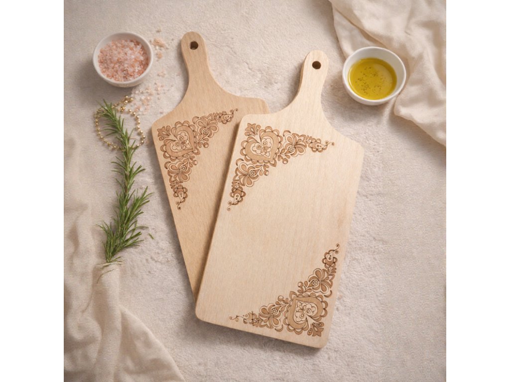 Představujeme Vám naše výjimečné bukové kuchyňské prkénko, které se pyšní nejen svou praktičností, ale i bohatou historií českého řemesla. Na každé dřevěné prkénko je vypálený originální podlužácký ornament vytvořený naší lidovou malérečkou Mirkou Ferstlovou.