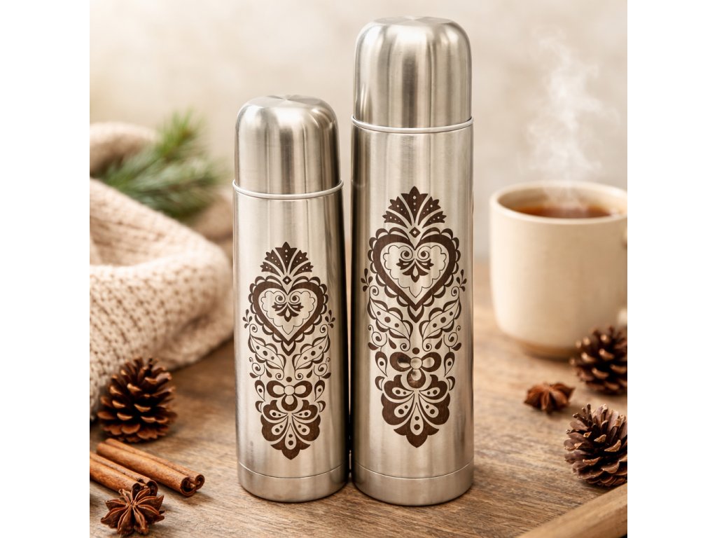 Naše termosky s podlužáckým ornamentem jsou ideálním dárkem pro ty, kteří ocení krásu lidových ornamentů a zároveň potřebují praktický a kvalitní produkt. Obohaťte si svůj život nebo svým blízkým tímto půvabným a užitečným doplňkem. Užijte si nejen skvělý nápoj, ale i krásný design s naší kolekcí nerezových termosek s podlužáckým ornamentem.